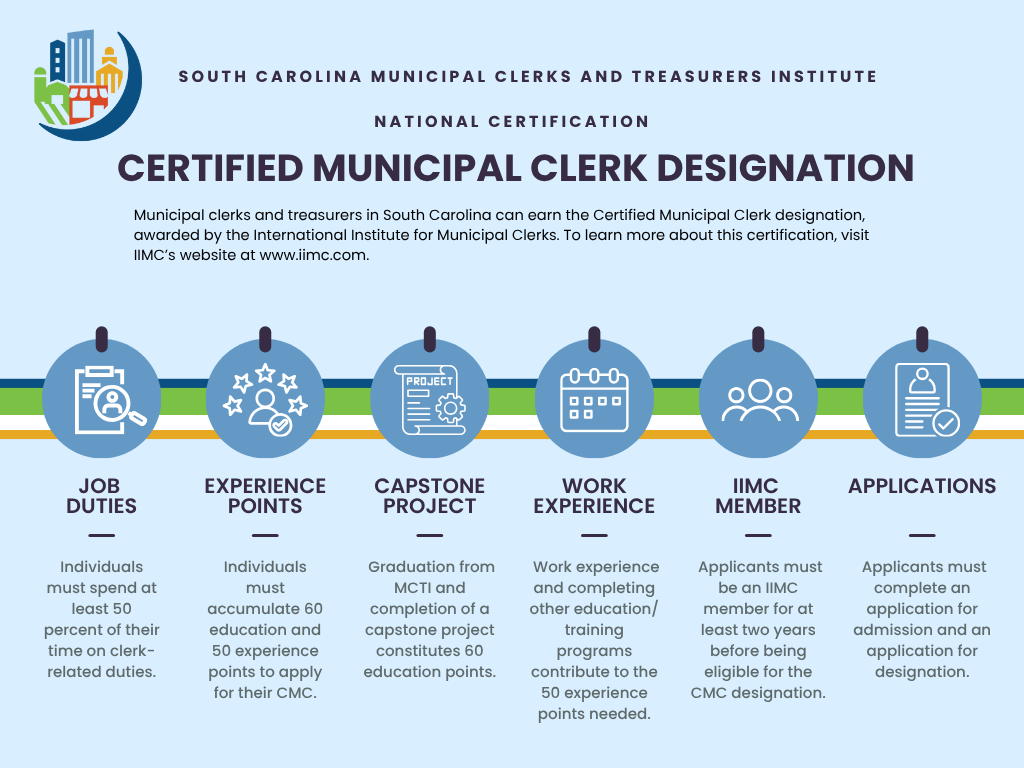The International Institute for Municipal Clerks awards the CMC designation to individuals who spend at least 50 percent of their time on clerk-related duties.