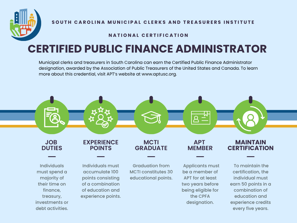 The Association of Public Treasurers of the United States and Canada awards the CPFA credential to individuals who spend a majority of their time on finance, treasury, investments or debt activities.