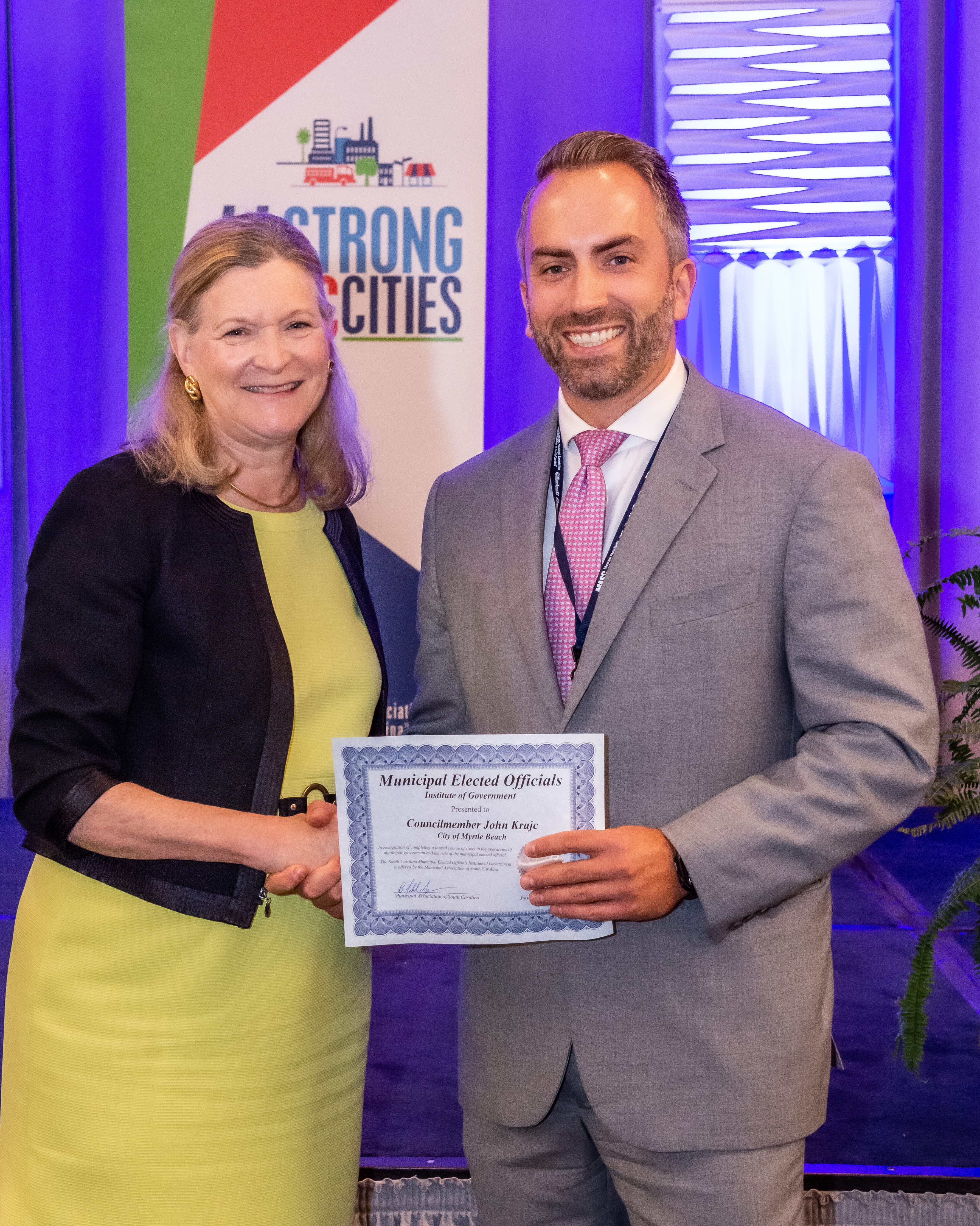 Councilmember James Krajc from the City of Myrtle Beach graduated from the Municipal Elected Officials Institute of Government. Graduates received their certificates during the Municipal Association of South Carolina’s Annual Meeting in July.