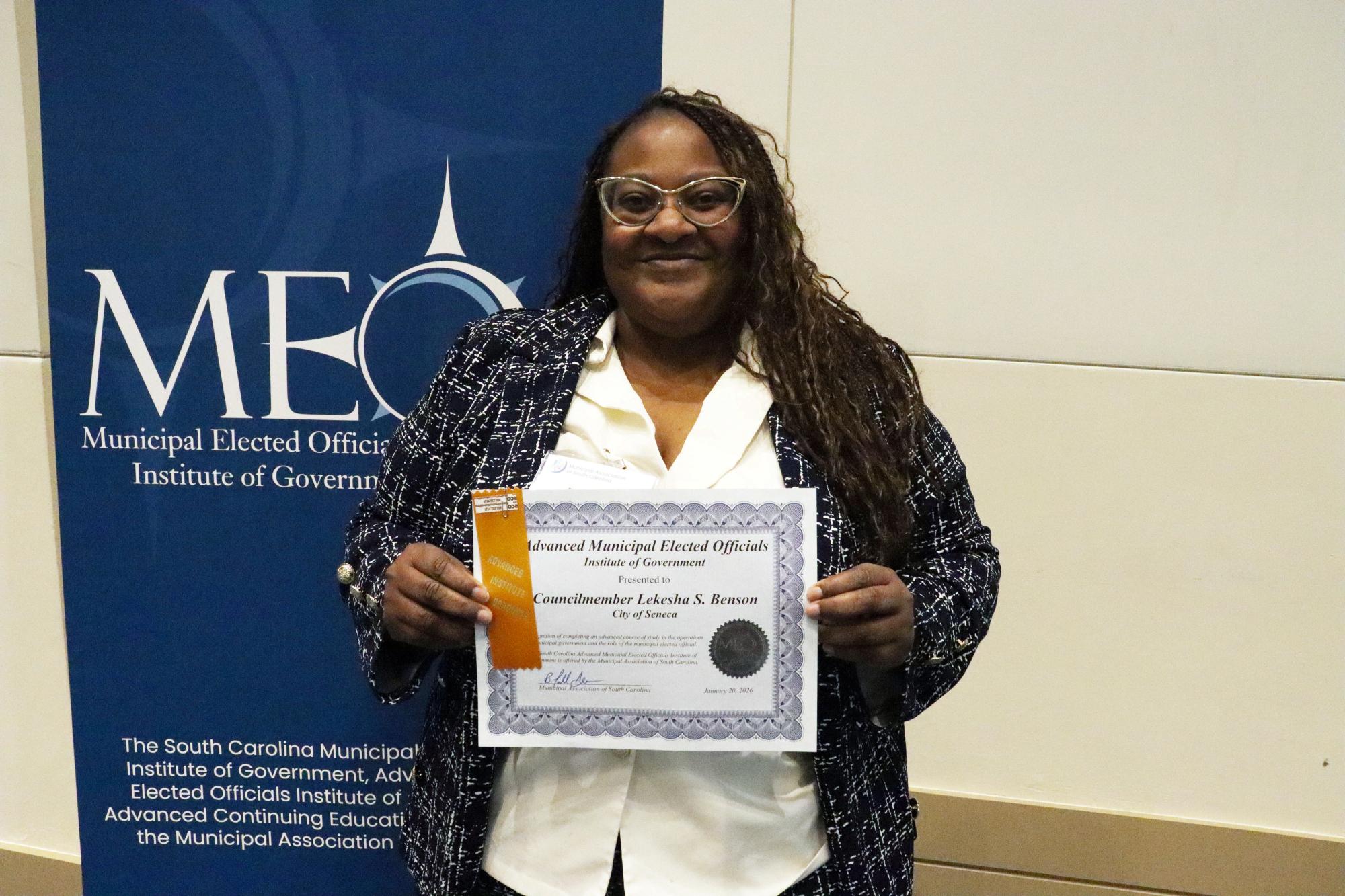 Councilmember Lekesha S. Benson of the City of Seneca has graduated from the Advanced Municipal Elected Officials Institute of Government. Graduates received their certificates during the Municipal Association of South Carolina’s Hometown Legislative Action Day on January 20, 2026.