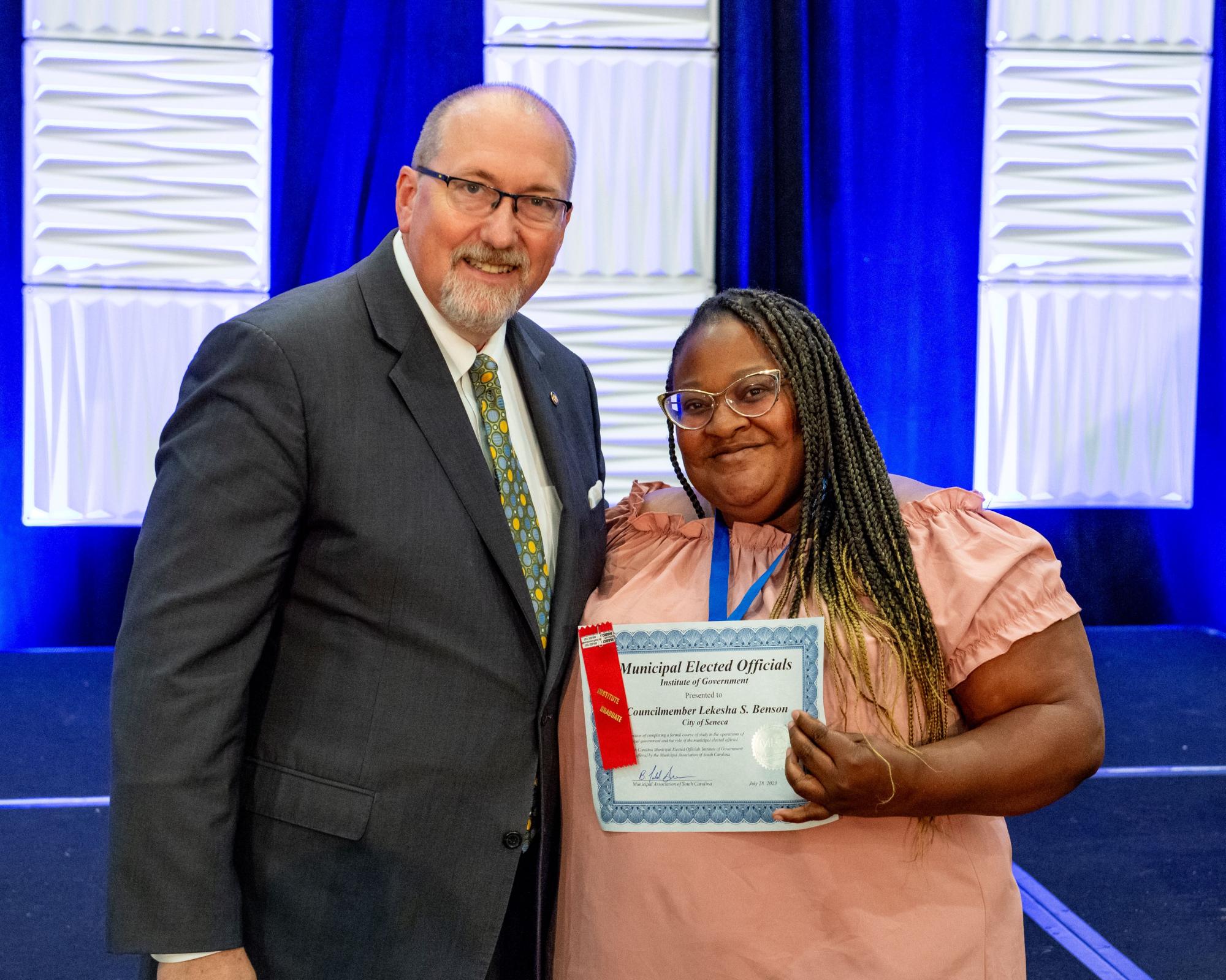 Councilmember Lekesha Benson from the City of Senenca graduated from the Municipal Elected Officials Institute of Government. Graduates received their certificates during the Municipal Association of South Carolina’s Annual Meeting in July.