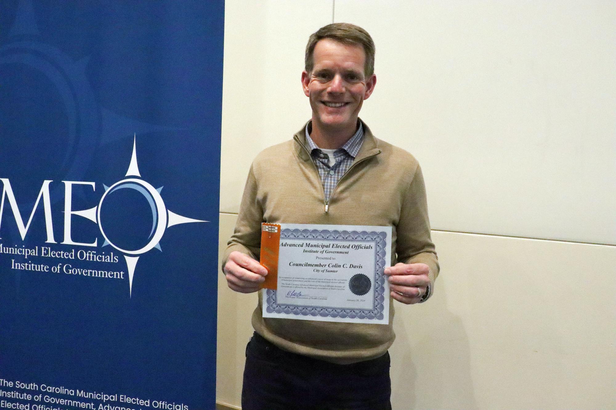 Councilmember Colin C. Davis of the City of Sumter has graduated from the Advanced Municipal Elected Officials Institute of Government. Graduates received their certificates during the Municipal Association of South Carolina’s Hometown Legislative Action Day on January 20, 2026.
