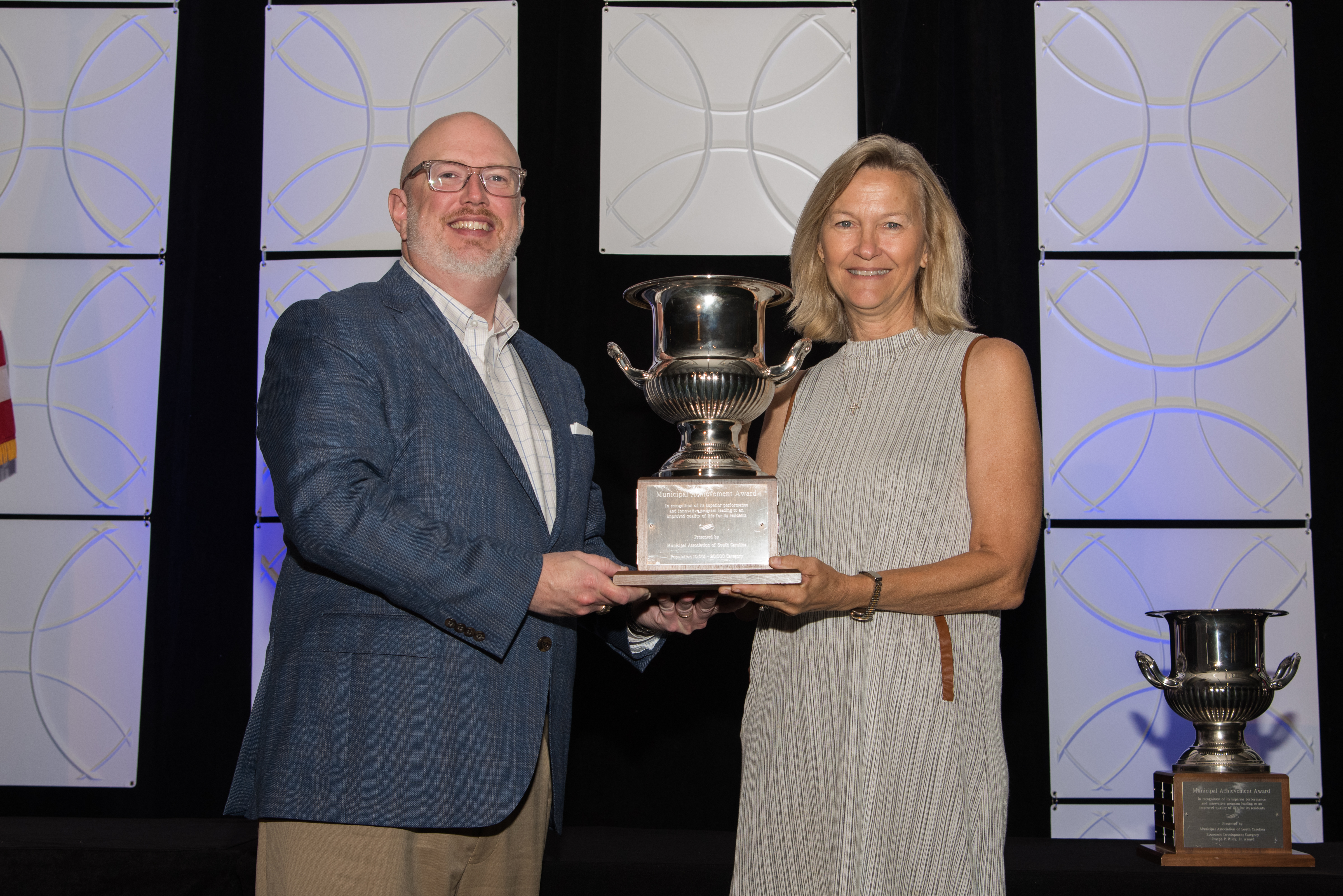 Municipal Association Executive Director Todd Glover, left, presents an Achievement Award trophy for Population 10,001 — 20,000 Category to Bluffton Mayor Lisa Sulka during the 2021 Annual Meeting on Hilton Head Island. (download image)