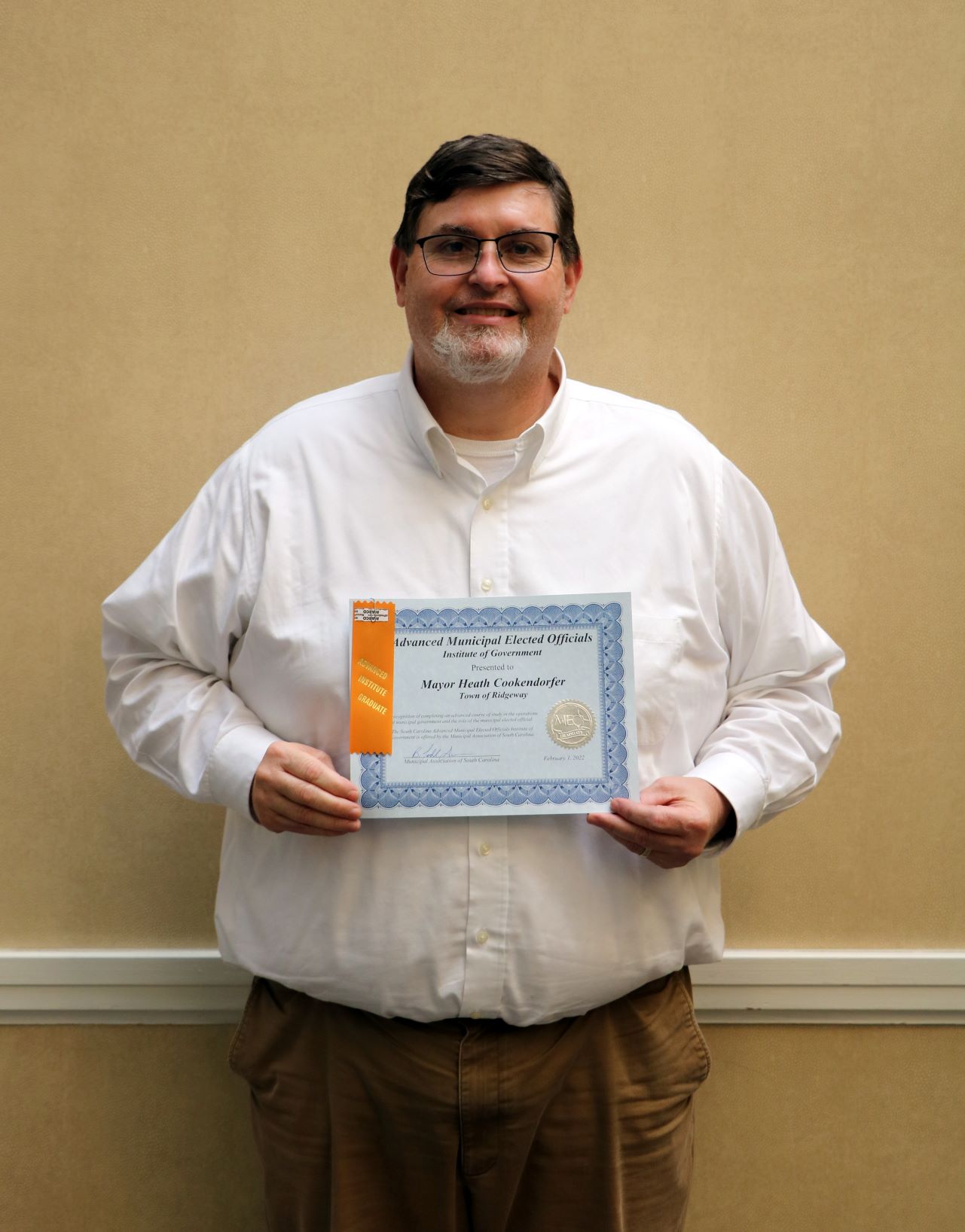 Mayor Heath Cookendorfer of the Town of Ridgeway has graduated from the Advanced Municipal Elected Officials Institute of Government. Graduates received their certificates during the Municipal Association of South Carolina's Hometown Legislative Action Day in February.
