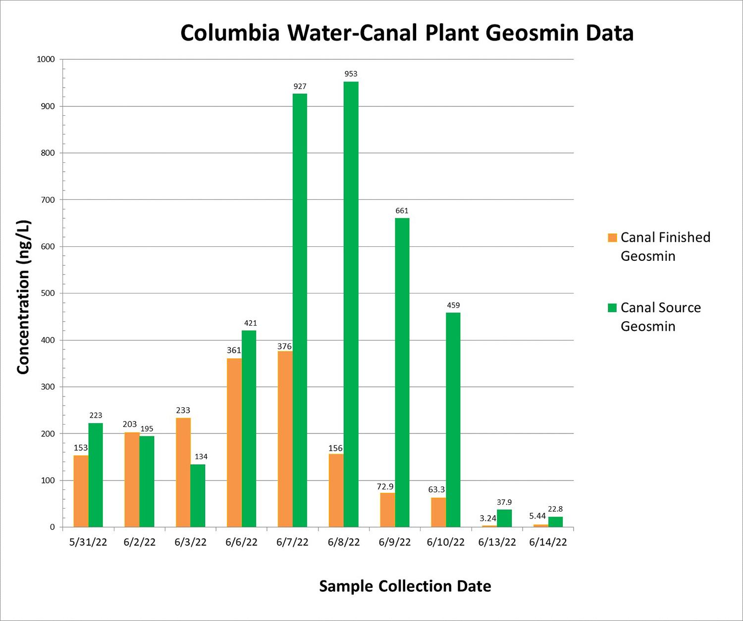 Columbia Water used this bar graph to explain the dramatic rise of geosmin levels,