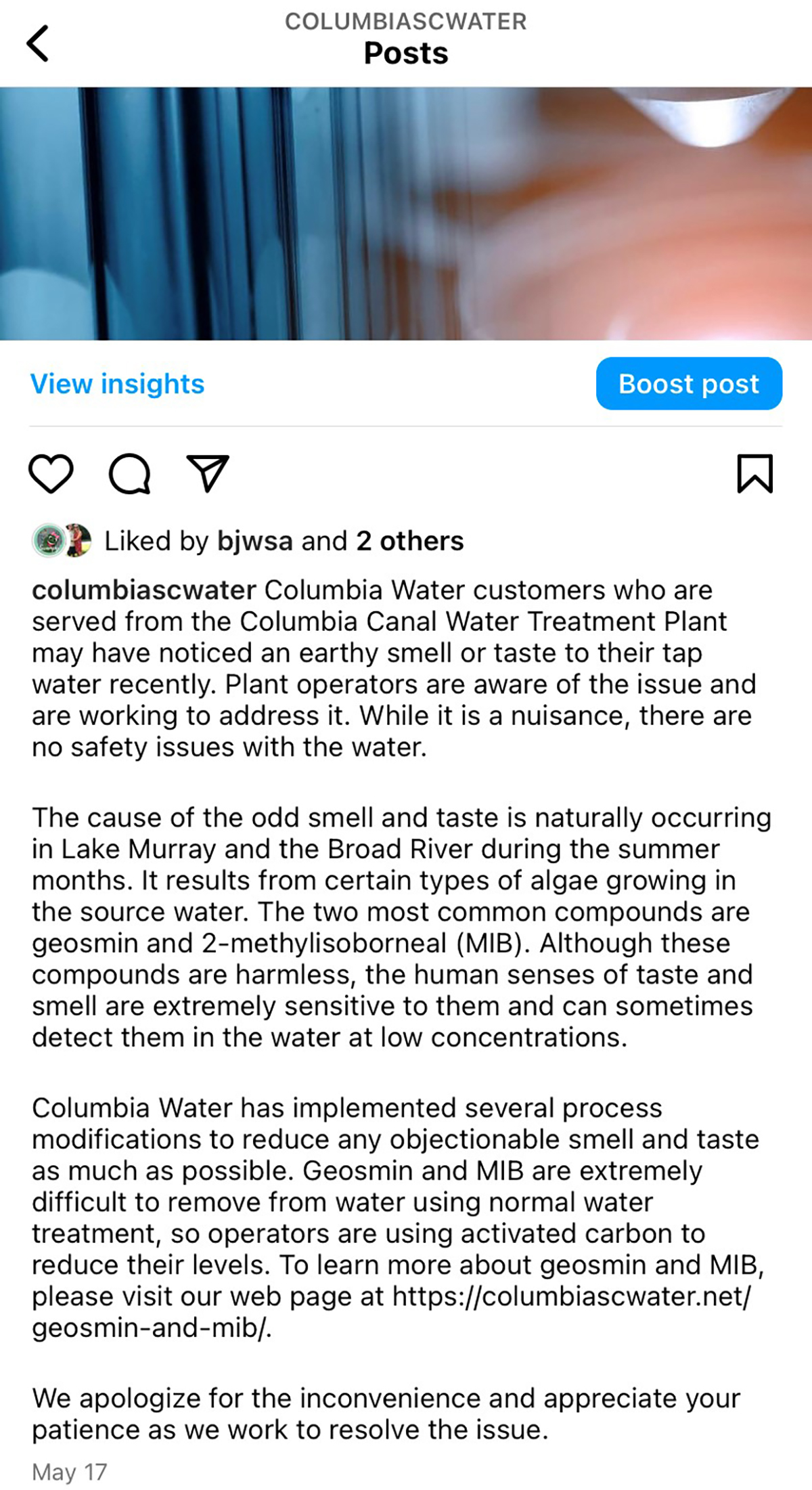 This May 17, 2022, Instagram post illustrates Columbia Water's early communicatons