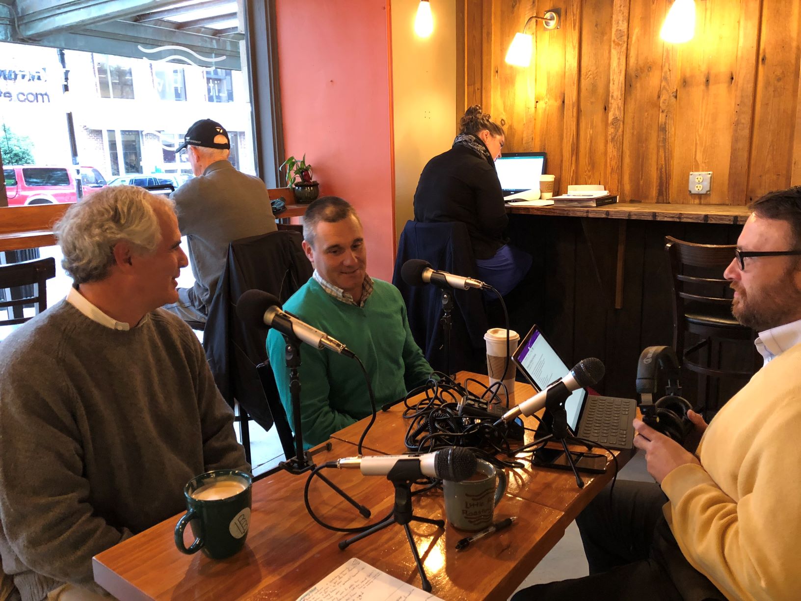 Tom Finnagan, left, and James Bakker, center, discuss the development of the Montgomery Building for a podcast with Spartanburg Communications Manager Christopher George.