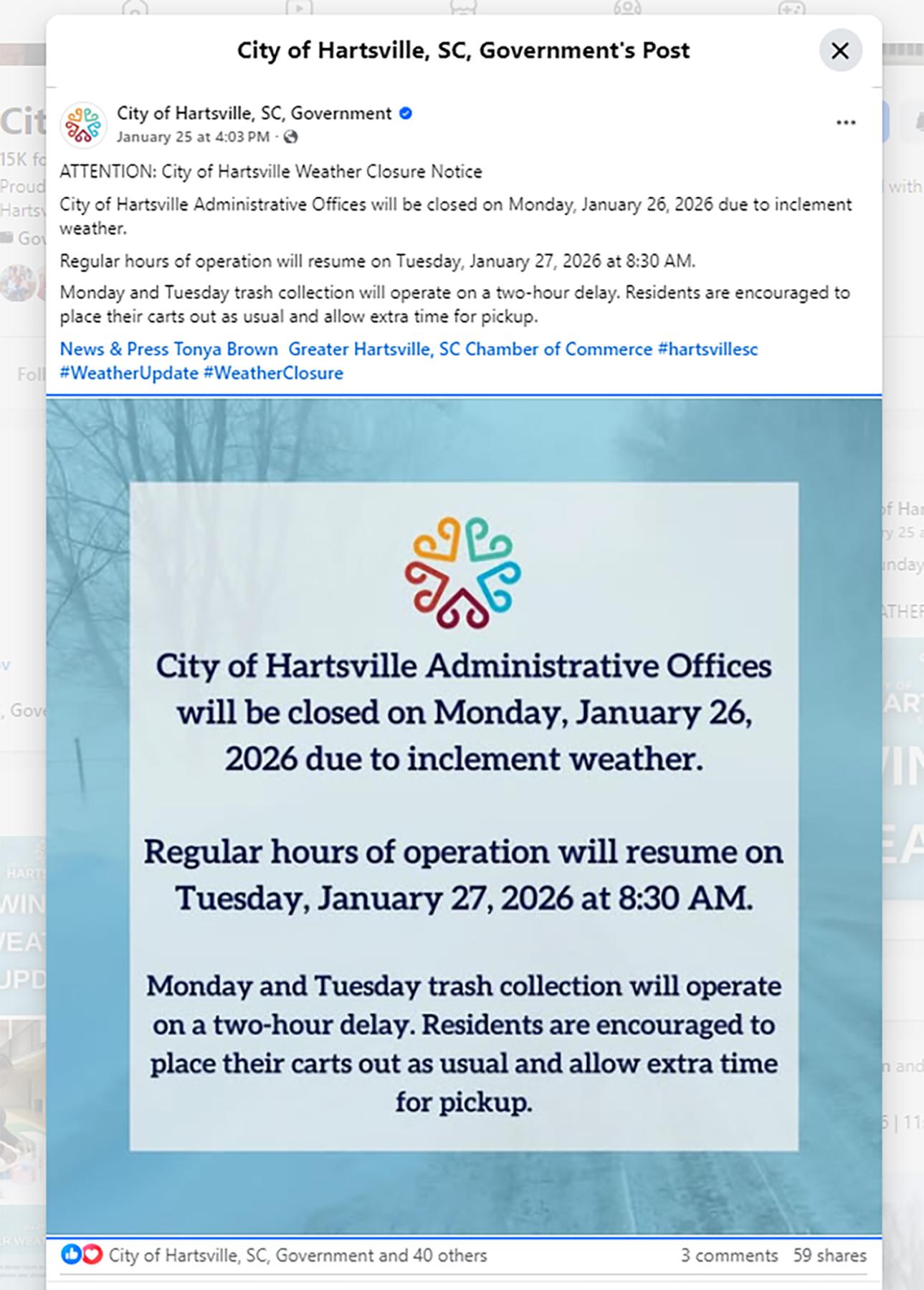 Hartsville keeps its city Facebook page strictly focused on official city business, reinforcing the idea that if something appears there, it matters to large numbers of people. Facebook posts routinely link back to the city’s website, where residents can find more details without having to scroll through feeds.