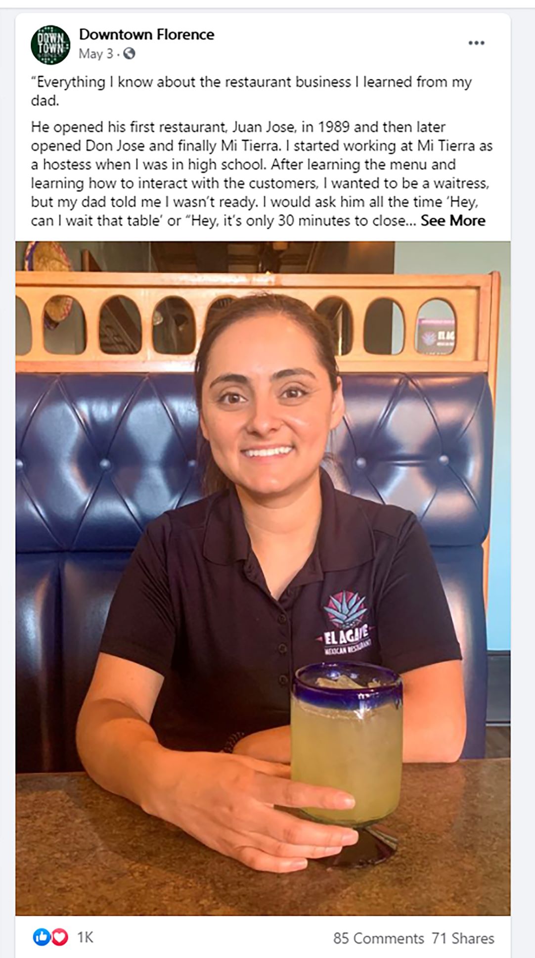 When Brenda Perez, co-owner of El Agave Mexican Restaurant in downtown Florence, was approached by Florence’s downtown development staff for an interview for their social media account, she was skeptical of it. Even so, she gave them a story of how she learned the business from her father’s restaurants, rising from her start as a hostess in her teens, and carrying it all the way through to her hope that her four-year-old son might manage the restaurant one day.