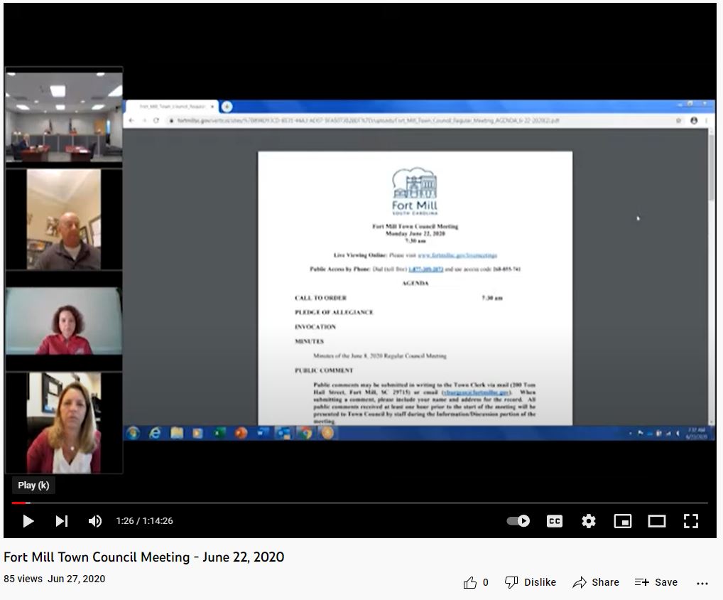 Recorded and streamed council meetings are nothing short of the norm for the Town of Fort Mill. When the pandemic forced the municipality to switch to a virtual format, the town live streamed its meetings using GoToMeeting.