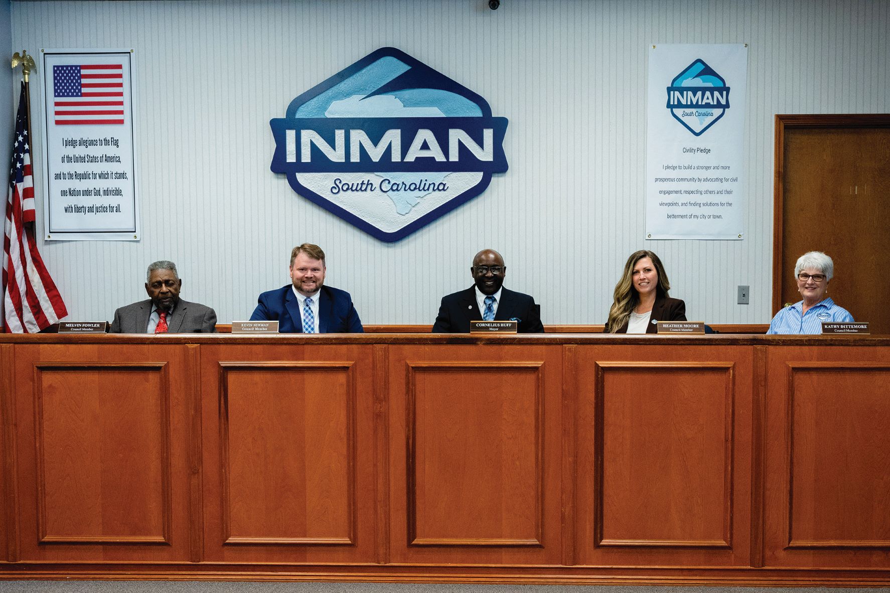 council bench, and opposite from the text of the Pledge of Allegiance. Photo: City of Inman.